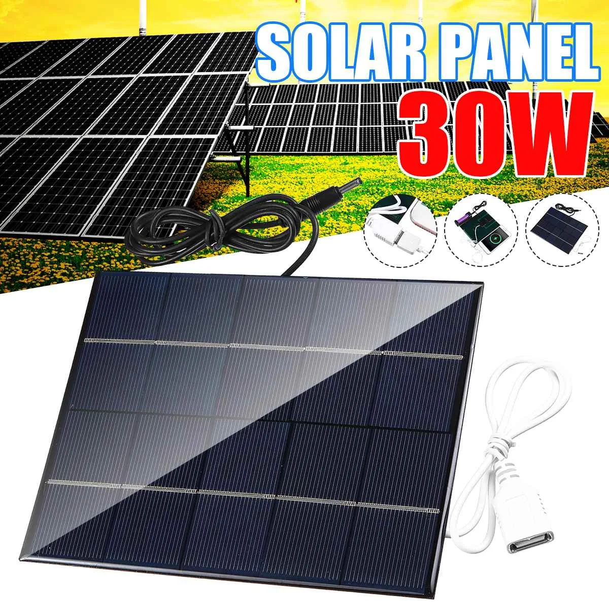 Buy 30W 5V Solar Panel With DC35MM Base For 18650 Rechargeable Battery+USB power bank Portable solar charger for Smart watch and You will Save USD 4.42 or 30% %, Becuase You Just Pay for 10.32 not Full Price for 14.74